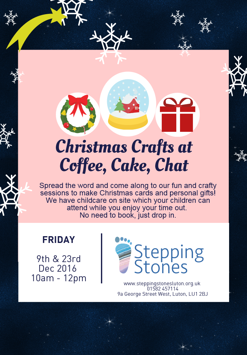 5 December 2016[fusion_builder_container hundred_percent=”yes” overflow=”visible”][fusion_builder_row][fusion_builder_column type=”1_1″ last=”yes” spacing=”yes” center_content=”no” hide_on_mobile=”no” background_color=”” background_image=”” background_repeat=”no-repeat” background_position=”left top” hover_type=”none” link=”” border_position=”all” border_size=”0px” border_color=”” border_style=”” padding=”” margin_top=”” margin_bottom=”” animation_type=”” animation_direction=”” animation_speed=”0.1″ animation_offset=”” class=”” id=””][fusion_text]Coffee cake chat started back in 2008 and it’s a time for women to get together, relax and enjoy themselves. It’s an informal environment, where you can meet new people or catch up with older friends, over a cup of tea and a chat. So please come along to coffee cake chat every 1st Friday of each month between 10am and 12pm. You don’t need to be a current client – all are welcome and no booking is required. You might be thinking about coming to see, you might be a previous client or you might be waiting to attend one of our programmes. We also run regular activity sessions on other Fridays throughout the month. Check out our website regularly for more information about what’s on. Our December activities are Christmas crafts themed:[/fusion_text][/fusion_builder_column][fusion_builder_column type=”1_1″ last=”yes” spacing=”yes” center_content=”no” hide_on_mobile=”no” background_color=”” background_image=”” background_repeat=”no-repeat” background_position=”left top” hover_type=”none” link=”” border_position=”all” border_size=”0px” border_color=”” border_style=”” padding=”” margin_top=”” margin_bottom=”” animation_type=”” animation_direction=”” animation_speed=”0.1″ animation_offset=”” class=”” id=””][fusion_imageframe lightbox=”no” gallery_id=”” lightbox_image=”” style_type=”none” hover_type=”none” bordercolor=”” bordersize=”0px” borderradius=”0″ stylecolor=”” align=”none” link=”” linktarget=”_self” animation_type=”0″ animation_direction=”down” animation_speed=”0.1″ animation_offset=”” hide_on_mobile=”no” class=”” id=””]