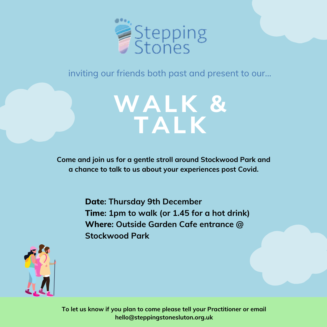 6 December 2021Calling all our friends past and present to come and join us this Thursday 9th December for a short stroll followed by a hot drink at Stockwood Park. It’s a chance to about life post-Covid and share your experiences and challenges.