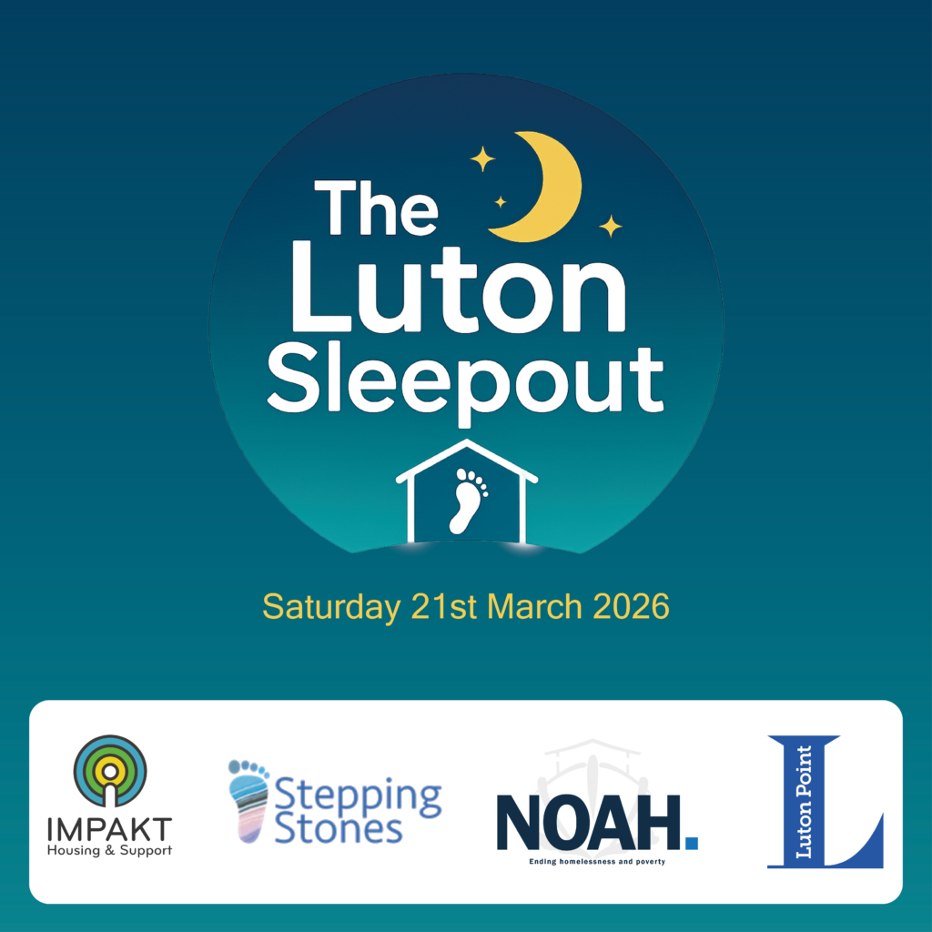 At Stepping Stones, we believe everyone in Luton deserves a home, so we’re teaming up with Noah Enterprise and IMPAKT Housing & Support to help make that a reality. On Saturday 21st March we’ll be spending the night sleeping out at Luton Point. We will be experiencing just a small part of what many people facing homelessness endure every day. We’d love you to join us for this special event designed to raise awareness of homelessness and generate vital funds.